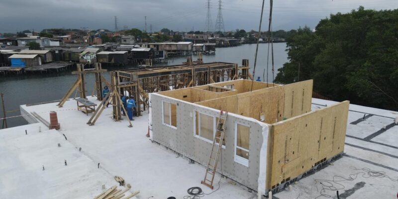 Por marcozero Compartilhe Compartilhe Santos Obras do Parque Palafitas seguem em ritmo acelerado 84 visualizações0 As obras do Parque Palafitas, projeto de revitalização da maior favela sobre a maré do País, ganharam um novo impulso com a instalação dos primeiros painéis pré-fabricados. Ao todo, 57 painéis foram posicionados para compor o andar térreo do primeiro prédio no Dique da Vila Gilda, em Santos. O empreendimento, que visa oferecer moradia digna e sustentável, prevê a construção de quatro conjuntos de apartamentos e dois de casas, totalizando 60 unidades habitacionais. As residências serão pré-fabricadas, o que acelera o processo de construção. Um guindaste içou o primeiro painel, com mais de uma tonelada, na última segunda-feira (18), fixando-o na primeira das sete lajes concretadas. Esta laje, suspensa sobre a maré, é sustentada por 49 estacas e blocos. Em visita às obras, o prefeito de Santos, Rogério Santos, destacou a rapidez do projeto. “Começamos a erguer o primeiro prédio, que ficará pronto em um mês”, afirmou o prefeito. “O Parque Palafitas é um projeto-piloto não só para Santos, mas para o Brasil. A obra vai mudar a vida de muita gente.” O primeiro prédio terá um andar térreo e um superior, cada um com quatro apartamentos, somando oito unidades. Além das moradias, a laje abrigará a associação de moradores. Soluções construtivas e infraestruturaO projeto adota uma metodologia de estaqueamento com laje, semelhante à usada em terminais portuários. As sete lajes de apoio foram concretadas sobre 212 estacas, fincadas a uma profundidade de 30 a 35 metros. Segundo o secretário de Infraestrutura e Serviços Públicos (Seinfra), Fabrício Cardoso, o projeto busca uma nova forma de ocupação sustentável em áreas de mangue. “A proposta é proporcionar condições dignas de moradia a famílias hoje instaladas precariamente no local”, disse. O secretário destacou que o Parque Palafitas contará com infraestrutura completa, incluindo iluminação pública, água, esgoto, áreas de lazer e comércio, além de espaços para regeneração do mangue. A área também terá telecomunicações e combate a incêndio. Detalhes das construções e investimento1º prédio (sobre a maré): Oito apartamentos, distribuídos em térreo e um andar. 2º prédio (no solo): Quatro andares, com 16 apartamentos. 3º prédio (no solo): Três andares, com 12 apartamentos. Casas (sobre a maré): 16 casas térreas, sendo oito para pessoas com deficiência (PcD). Área comercial: Duas edificações em formato de ‘L’ e um píer flutuante para embarcações. As unidades habitacionais, sejam apartamentos ou casas, contarão com dois quartos, sala, cozinha e banheiro. As construções gerais de apoio, institucionais e comerciais ocuparão 309 m². O investimento total no projeto, que envolve fundações e a construção das unidades habitacionais, é de R$ 29.266.364,04, com participação do Governo do Estado e da Prefeitura de Santos. As obras de fundação, a cargo da TMK Engenharia S.A., têm prazo contratual até outubro. A construção das moradias, de responsabilidade da Tecverde Engenharia S.A., deve ser finalizada em fevereiro. Compartilhe